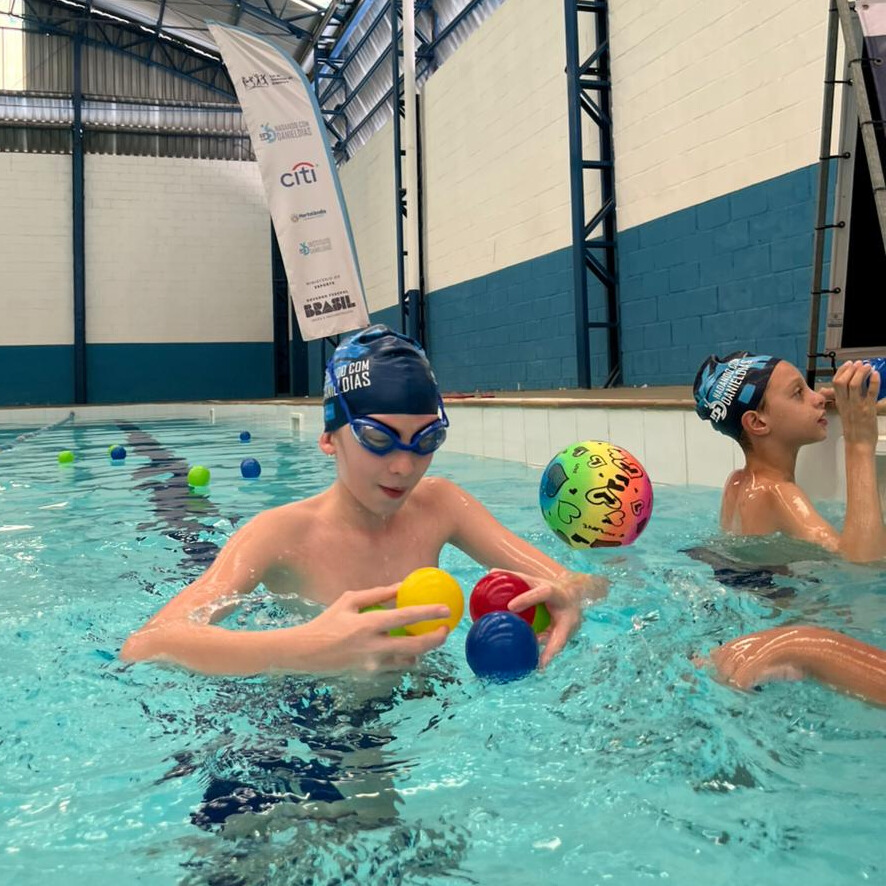 Na última semana de janeiro, a sede de Hortolândia (SP) do projeto Nadando com Daniel Dias realizou uma atividade lúdica em piscina com foco no consumo de água. Durante a atividade, a equipe técnica distribuiu cones e argolas em pontos da piscina, representando as casas das crianças. Bolinhas flutuantes foram espalhadas na água e apresentadas aos participantes como reservas de água.